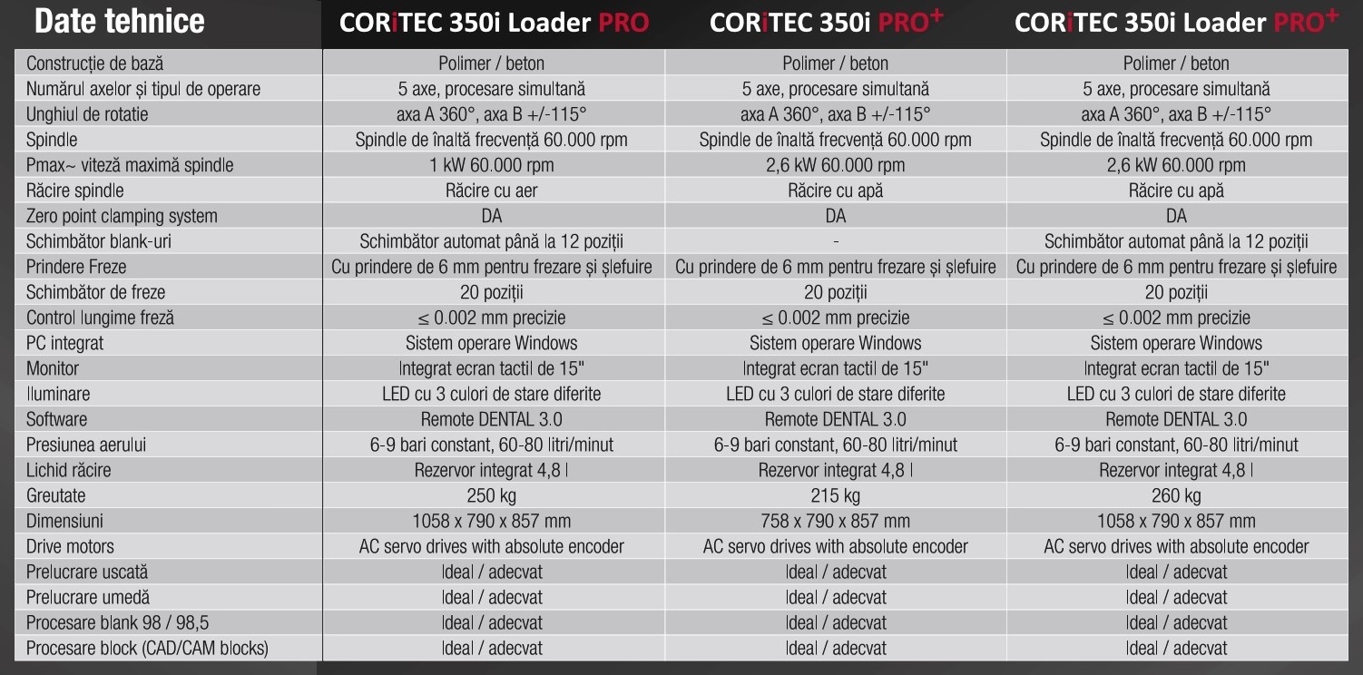 Sistemul de procesare CORiTEC 350i este un concept de mașină inovatoare, dezvoltat pentru a răspunde oricăror cerințe moderne de procesare CAD/CAM. Prelucrarea blank-urilor din toate materialele relevante cum ar fi cobalt crom, titan, dioxid de zirconiu, materiale plastice, blocuri de materiale și materiale noi viitoare este posibilă printr-un singur sistem de mașină, practic fără restricții.